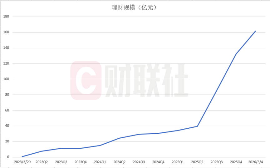 进入2025年,该产品前三季度规模从30.63亿元攀升至85.65亿元,第四季度单季度净增超46亿元,以131.94亿元收官。进入2026年,规模继续增长,据招银理财提供数据,截至3月4日,产品规模已突破160亿元,达161.6亿元