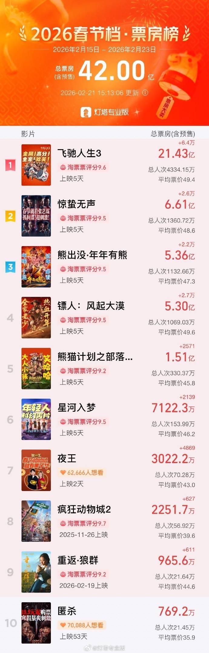 IT之家从灯塔专业版获悉,截至 2 月 21 日 15 时 13 分,2026 春节档(2 月 15 日-2 月 23 日)档期总票房(含预售)突破 42 亿。