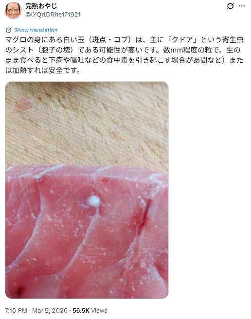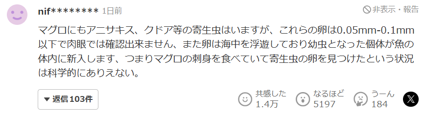 而当这则新闻传回日本,日本网友则集体炸锅了。有人开启了硬核科普模式,认为金枪鱼体内的寄生虫卵通常极其微小,直径仅在0.02〜0.1mm(20〜100μm)左右,肉眼根本无法看见。原本必须通过显微镜才能观察到的东西,却被声称“经肉眼确认”,这不禁让人怀疑背后是否介入了其他意图。
