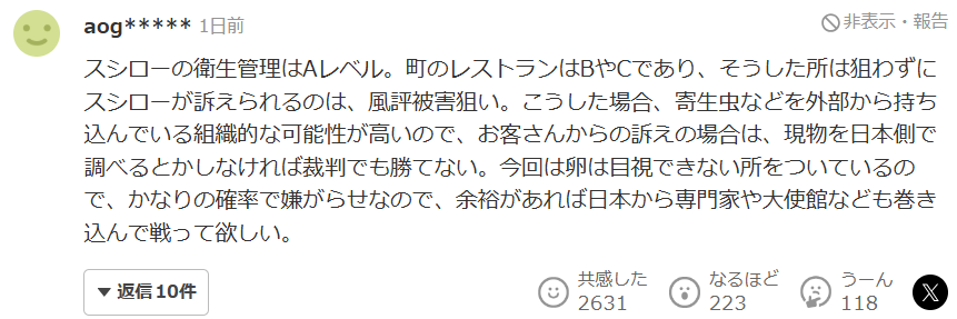 寿司郎的卫生管理是A等级,而街边很多普通餐馆只有B级或C级。那些地方却没人去针对,偏偏盯上了寿司郎去起诉,这明显是想制造舆论、造成名誉损害。在这种情况下,很有可能是有人组织性地从外部带入寄生虫之类的东西。如果是顾客提出投诉,日本方面应该对实物进行检测,否则即使打官司也很难赢。这次是抓住了‘虫卵肉眼看不见’这一点来做文章,所以相当大概率是恶意骚扰。如果条件允许,希望能从日本派专家进来一起应对。