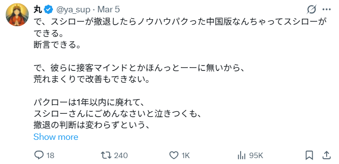 要是寿司郎撤出的话,中国那边肯定马上就会出现一个抄它模式的‘山寨版寿司郎’。这一点我可以断言。而且他们真的完全没有那种服务行业的接客意识,到时候店里肯定乱成一团,也根本没办法好好改善。这个‘山寨寿司郎’估计一年之内就会没落,最后再哭着跑来跟寿司郎道歉求回归,但寿司郎那边已经决定撤退了,也不会再改变。