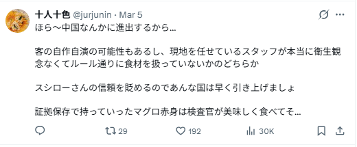 看吧,谁让你们非要进军中国呢……要么就是顾客自导自演的可能性,要么就是当地负责运营的员工卫生观念真的很差,没有按规定处理食材。这样只会损害寿司郎的信誉,至于被当作证据带走保存的那块金枪鱼赤身,说不定最后是被检查人员美滋滋地吃掉了呢……