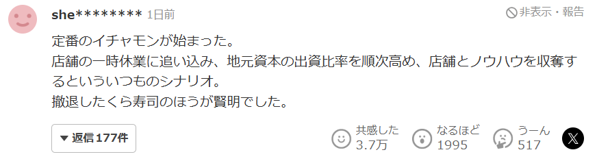 那种典型的“找茬”又开始了。这套剧本我熟,先逼得店铺暂停营业,然后一步步提高本地资本的持股比例,最后把人家的店面和经营技术全部搜刮走。这么看,早早撤出的“藏寿司”才是明智之举。